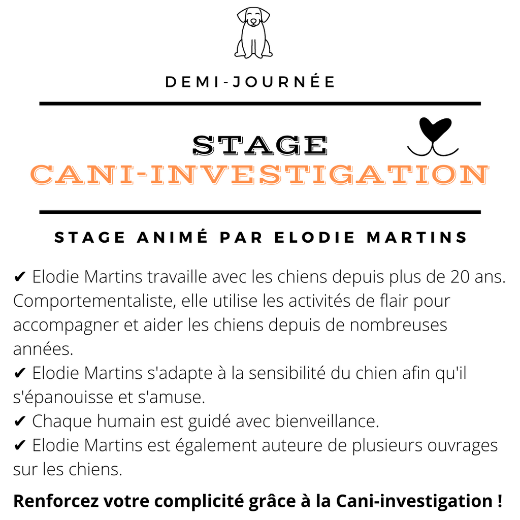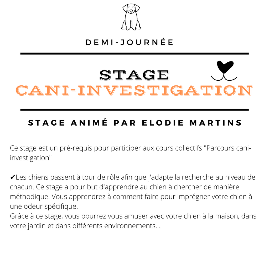 Le stage permet d'initier votre chien à la recherche d'odeur. Il est conseillé afin de participer aux séances collectives. Et adapté pour les chiens réactifs vis à vis des congénères.