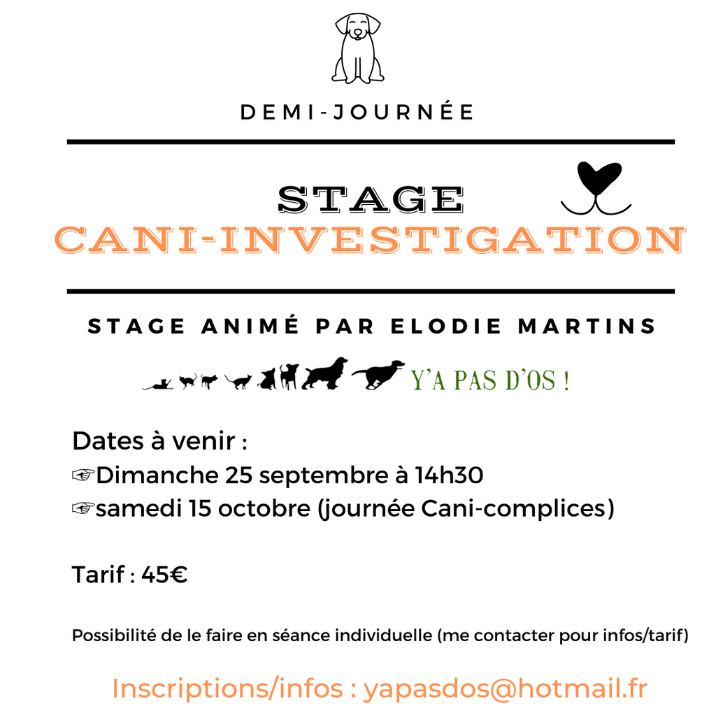 Les chiens passent à tour de rôle afin que j'adapte la recherche au niveau de chacun. Ce stage a pour but d'apprendre au chien à chercher de manière méthodique. Vous apprendrez à comment faire pour imprégner votre chien à une odeur spécifique.
