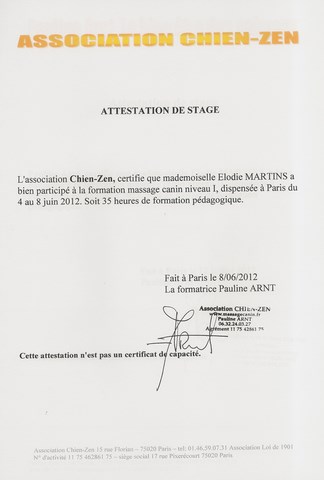 Attestation pour le séminaire de myothérapie canine-4 jours