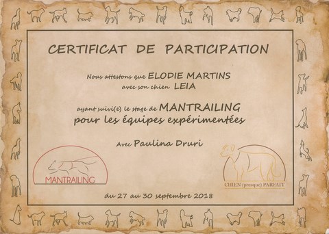 Attestation pour le stage pratique de mantrailing-3 jours- 2020