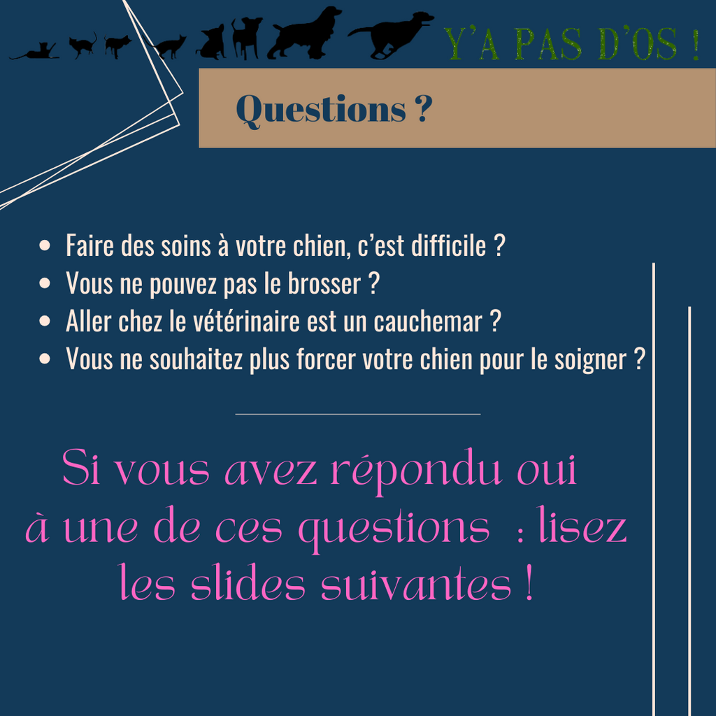 3 Sessions pour vous apprendre les bases du soin coopératif et vous entraîner à prendre soin de votre chien avec sa pleine collaboration.